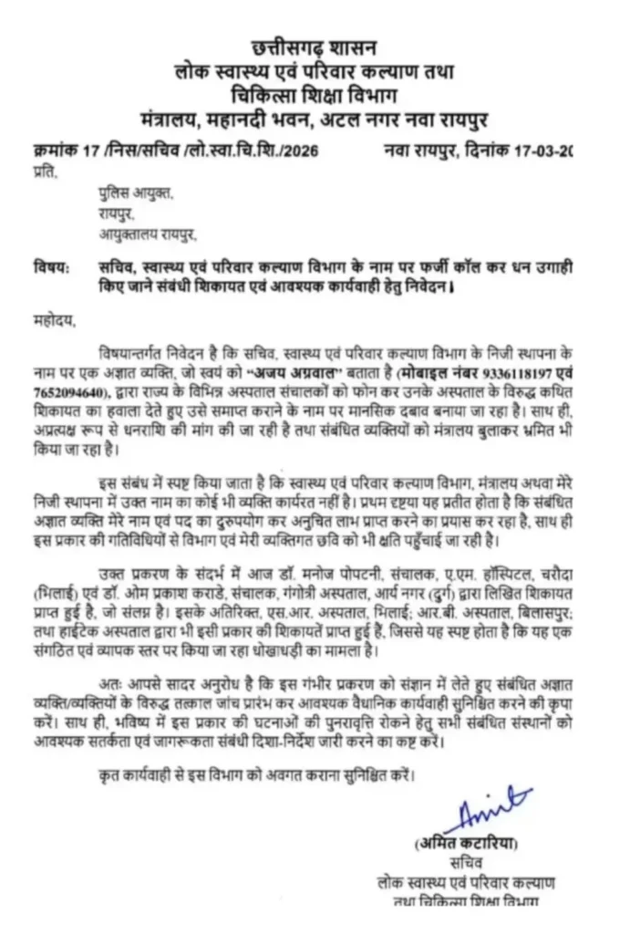 स्वास्थ्य सचिव अमित कटारिया ने पुलिस कमिश्नर संजीव शुक्ला को पत्र लिखकर एफआईआर दर्ज करने और कड़ी कार्रवाई की मांग की है। उन्होंने इसे विभाग की छवि को नुकसान पहुंचाने की कोशिश बताया है।