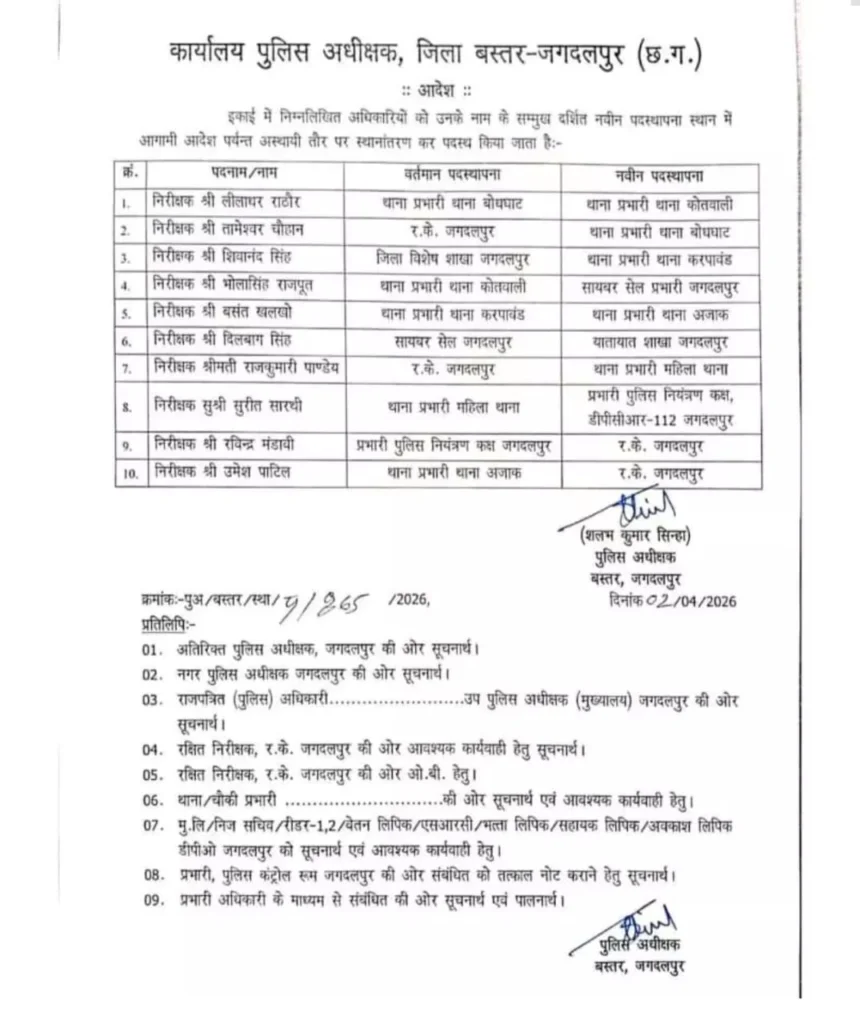 जगदलपुर, 03 अप्रैल 2026। बस्तर जिले में कानून व्यवस्था को और मजबूत बनाने के उद्देश्य से पुलिस विभाग ने बड़े प्रशासनिक बदलाव किए हैं। पुलिस अधीक्षक शलभ कुमार सिन्हा ने आदेश जारी कर जिले के 10 थानों के प्रभारियों के कार्यक्षेत्र में बदलाव किया।