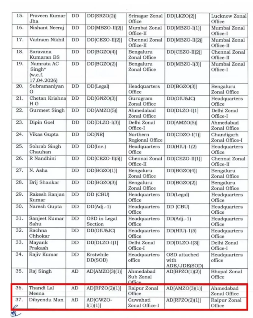 जारी आदेश के अनुसार, रायपुर में पदस्थ सहायक निदेशक टीएल मीणा का तबादला अहमदाबाद कर दिया गया है। उनकी जगह गुवाहाटी जोनल ऑफिस से दिव्येंदु मान को रायपुर की जिम्मेदारी सौंपी गई है।